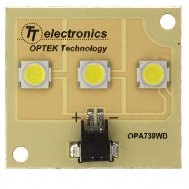 This is manufactured by TT Electronics/Optek Technology. The manufacturer part number is OPA739WD. It is assigned with possible HTSUS value of 8541.41.0000. In addition, it is reach unaffected. The given current test of the product is [Current -Test]. In addition, 6500k is the given CCT value of the product. It comes in led module configuration. It is supplied with a domed lens. The given maximum current is 350ma. Furthermore, 40° is the viewing angle of the product. The product is available in linear light strip configuration. The luminous flux of the product is 144lm (typ). The product's diameters include 38.10mm l x 34.92mm w. The product's test temperature is 25°c. The typical forward voltage (Vf) of the product is 10.8v. Its typical moisture sensitivity level is 1 (unlimited). The splendid features of the product include with connector. It has a classic white, cool colour. The product opa739, is a highly preferred choice for users. In addition, the height is 7.62mm. 38 lm/w of watts at test current. Moreover, it corresponds to opa739, a base product number of the product. The product is designated with the ear99 code number