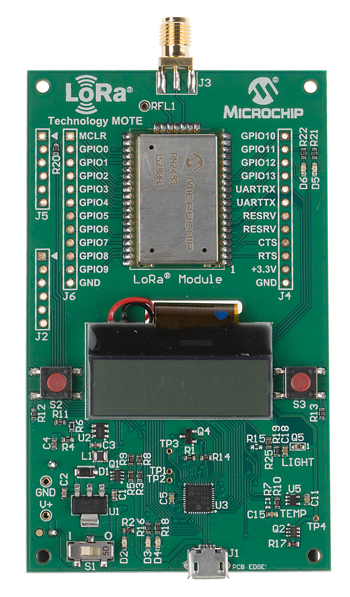 This is LoRa Mote LoRa Development Board for RN2483 manufactured by Microchip. The manufacturer part number is DM164138.