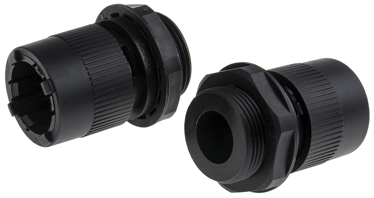 This is Adapter Cable Conduit Fitting Nylon 66 20mm nominal size PG-21 manufactured by RS Pro. The manufacturer part number is 755-9051. It has a typical thread size of pg21. The product is made from highly stable and reliable nylon 66.