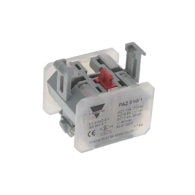 This is manufactured by Carlo Gavazzi Inc.. The manufacturer part number is PA2010/1. It is assigned with possible HTSUS value of 8538.90.8180. It is shipped in box. The product pa2, is a highly preferred choice for users. Moreover, it has screw terminal terminal style. In addition, it is reach unaffected. Its typical moisture sensitivity level is not applicable. Compatible with series carlo gavazzi, pb. It has an integral spst-nc circuit. The given contact rating of the product and its voltage includes 10a @ 250vac. It has a long 18 weeks standard lead time. The product requires switch body. Moreover, it corresponds to pa2010, a base product number of the product. The product is designated with the ear99 code number