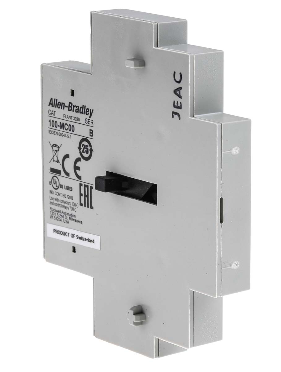 This is Screw Interlock Switch 690V 81 x 45 x 80.5 mm manufactured by Allen Bradley. The manufacturer part number is 100-MCA00. It is a type of mechanical interlock accessory.