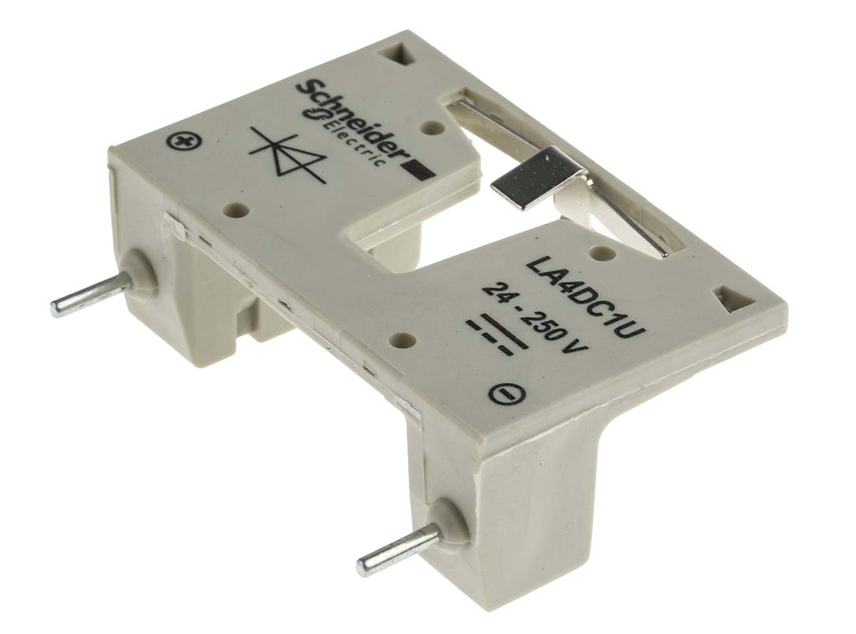 This is Coil Suppressor for use with TeSys D Series manufactured by Schneider Electric. The manufacturer part number is LA4DC1U. The product la4d, is a highly preferred choice for users. It is a type of surge suppressor accessory.