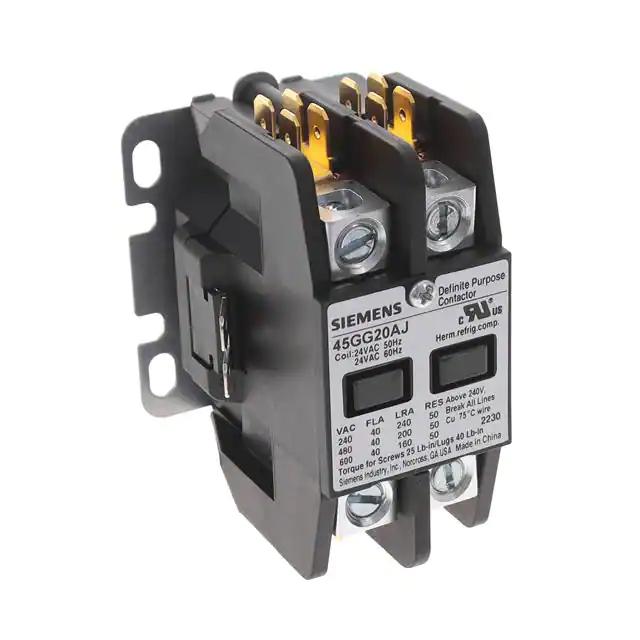 This is manufactured by Siemens. The manufacturer part number is 45GG20AJ. The coil voltage of the product is 24vac. Moreover, it has screw terminal terminal style. The product has 70°c operating temperature range. The product's switching voltage is 600vac - max. In addition, it is reach unaffected. It is shipped in box. It also has a dpst-no (2 form a) contact form. Its typical moisture sensitivity level is not applicable. It has a long 3 weeks standard lead time. It has a contact current rating of 40 a. The splendid features of the product include auxiliary contacts. The product is available in chassis mount configuration. Moreover, it corresponds to 45gg, a base product number of the product.