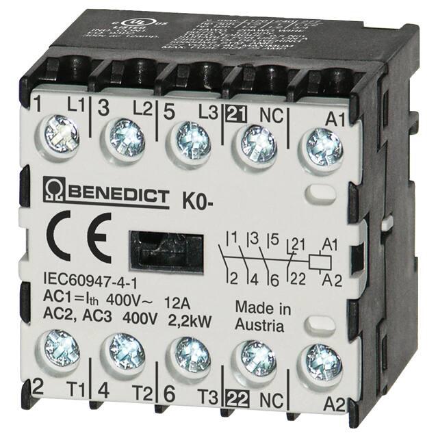 This is manufactured by Benedict GmbH. The manufacturer part number is K0-05D00-40 110. The coil voltage of the product is 110vac. It is assigned with possible HTSUS value of 8536.49.0065. It is shipped in box. The product k0, is a highly preferred choice for users. It also has a 4pst-no (4 form a) contact form. The product is rohs3 compliant. Moreover, it has screw terminal terminal style. The product's switching voltage is 480v. The product is available in din rail configuration. The product has -40°c ~ 90°c operating temperature range. It has a contact current rating of 5 a.