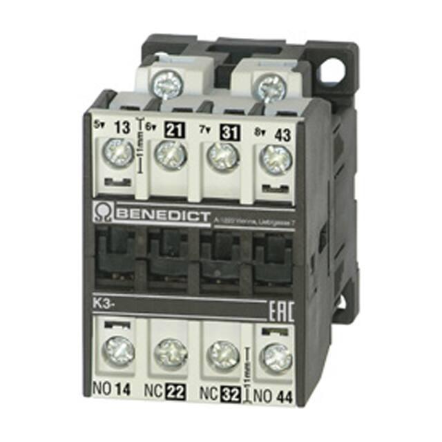 This is manufactured by Benedict GmbH. The manufacturer part number is K3-10NA00-22 230. The coil voltage of the product is 230vac. It is assigned with possible HTSUS value of 8536.49.0065. It is shipped in box. The product k3, is a highly preferred choice for users. It also has a 4pst-2no/2nc (2 form a, 2 form b) contact form. The product is rohs3 compliant. Moreover, it has screw terminal terminal style. The product's switching voltage is 600v. The product is available in chassis mount, din rail configuration. The product has -40°c ~ 90°c operating temperature range. It has a contact current rating of 10 a.