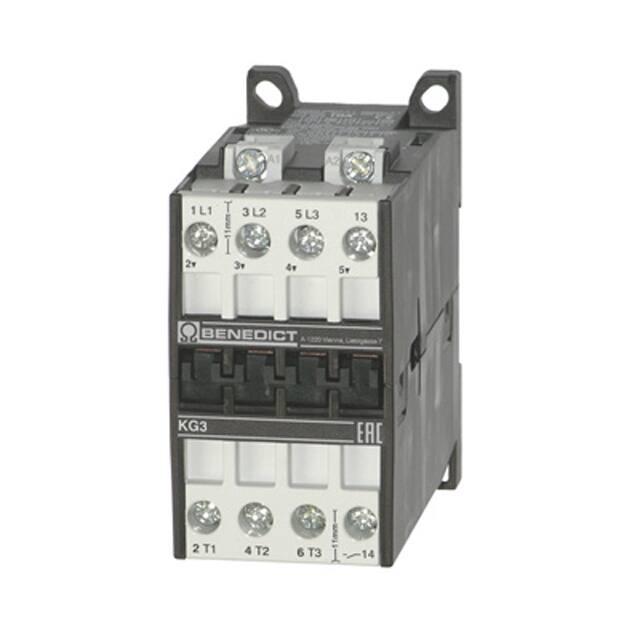 This is manufactured by Benedict GmbH. The manufacturer part number is KG3-18A01 24. The coil voltage of the product is 24vdc. The splendid features of the product include auxiliary contacts. It is assigned with possible HTSUS value of 8536.49.0065. It is shipped in box. The product k3, is a highly preferred choice for users. It also has a 3pst-no (3 form a) contact form. The product is rohs3 compliant. Moreover, it has screw terminal terminal style. The product's switching voltage is 600v. The product is available in chassis mount, din rail configuration. The product has -40°c ~ 90°c operating temperature range. It has a contact current rating of 18 a.