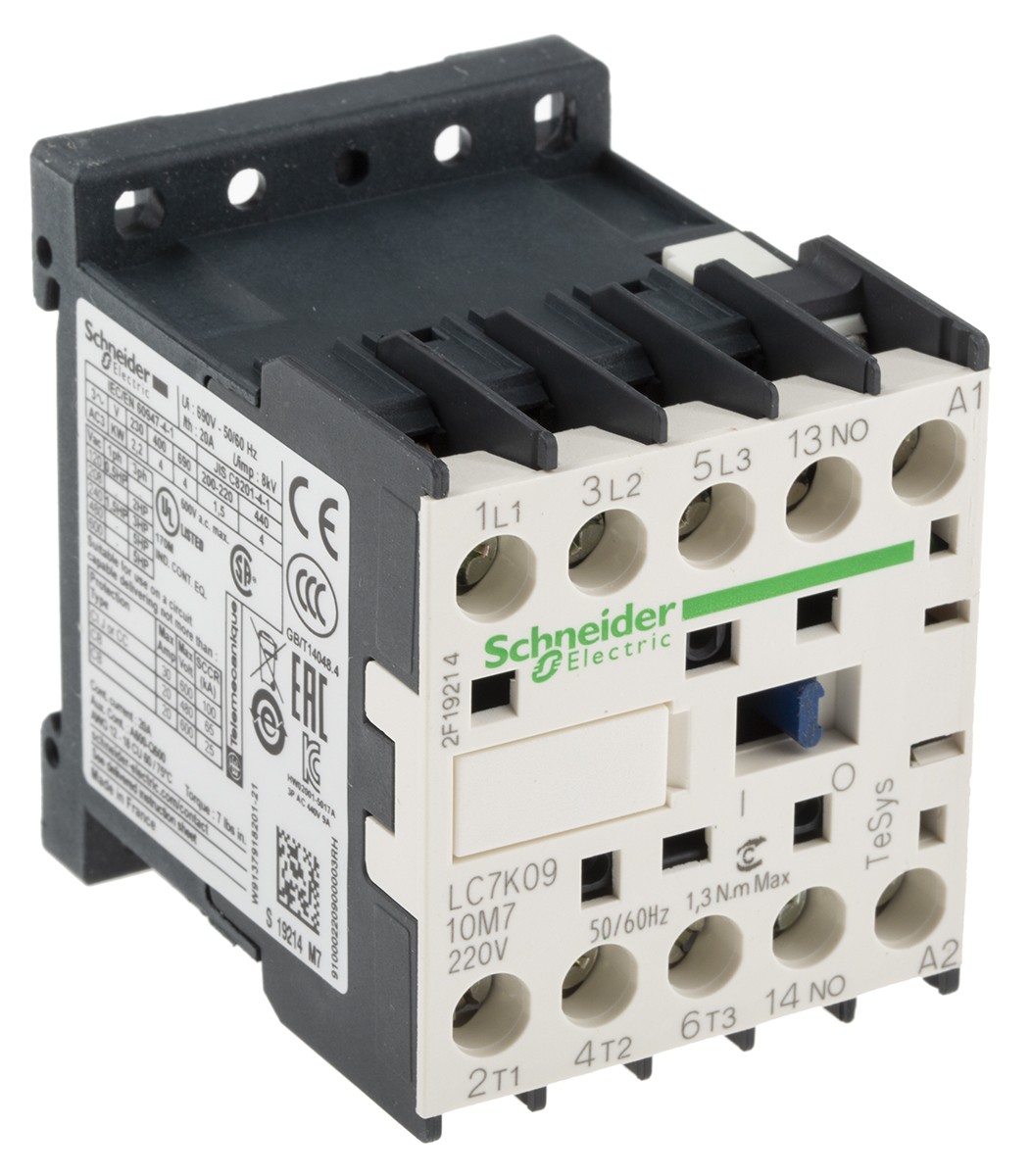 This is TeSys K LC7K 3 Pole Contactor 9 A 4 kW 220 V ac Coil manufactured by Schneider Electric. The manufacturer part number is LC7K0910M7. It has a maximum operating temperature of +50°c. The product lc7k, is a highly preferred choice for users. Whereas, the minimum operating temperature of the product is -25°c. The coil voltage of the product is 230 v ac. Its accurate length is 58mm. Furthermore, the product is 45mm wide. The product comes in 57mm depth. It has equipped with 3 poles. The terminal is a screw type.