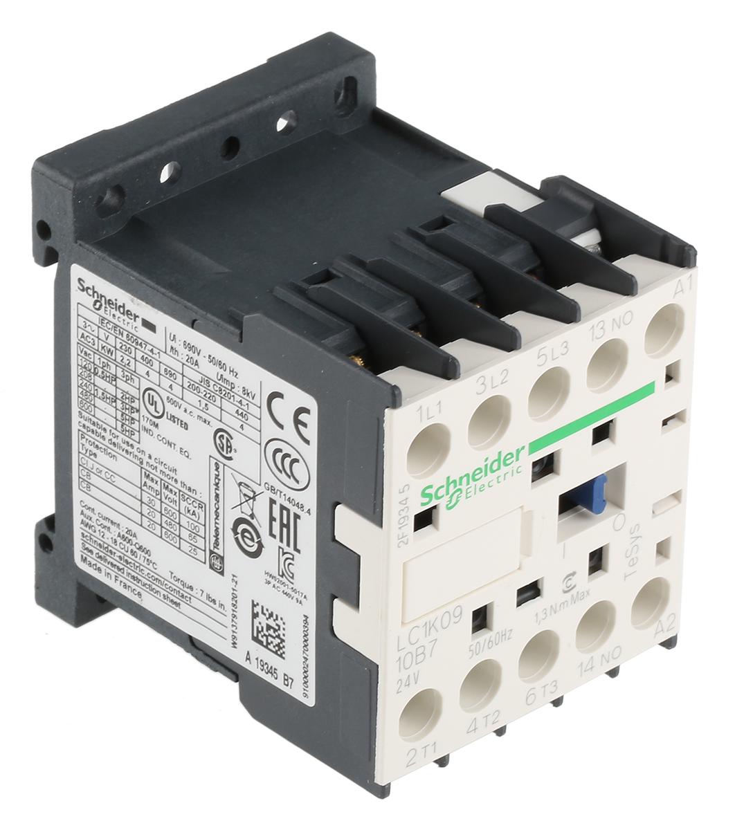 This is TeSys K LC1K 3 Pole Contactor 3NO 9 A 4 kW 24 V ac Coil manufactured by Schneider Electric. The manufacturer part number is LC1K0910B7. It performs basic function of motor control. It has a maximum operating temperature of +50°c. The product lc1k, is a highly preferred choice for users. Whereas, the minimum operating temperature of the product is -25°c. The coil voltage of the product is 24 v ac. Its accurate length is 58mm. Furthermore, the product is 45mm wide. The product comes in 57mm depth. It has equipped with 3 poles. The terminal is a screw type.