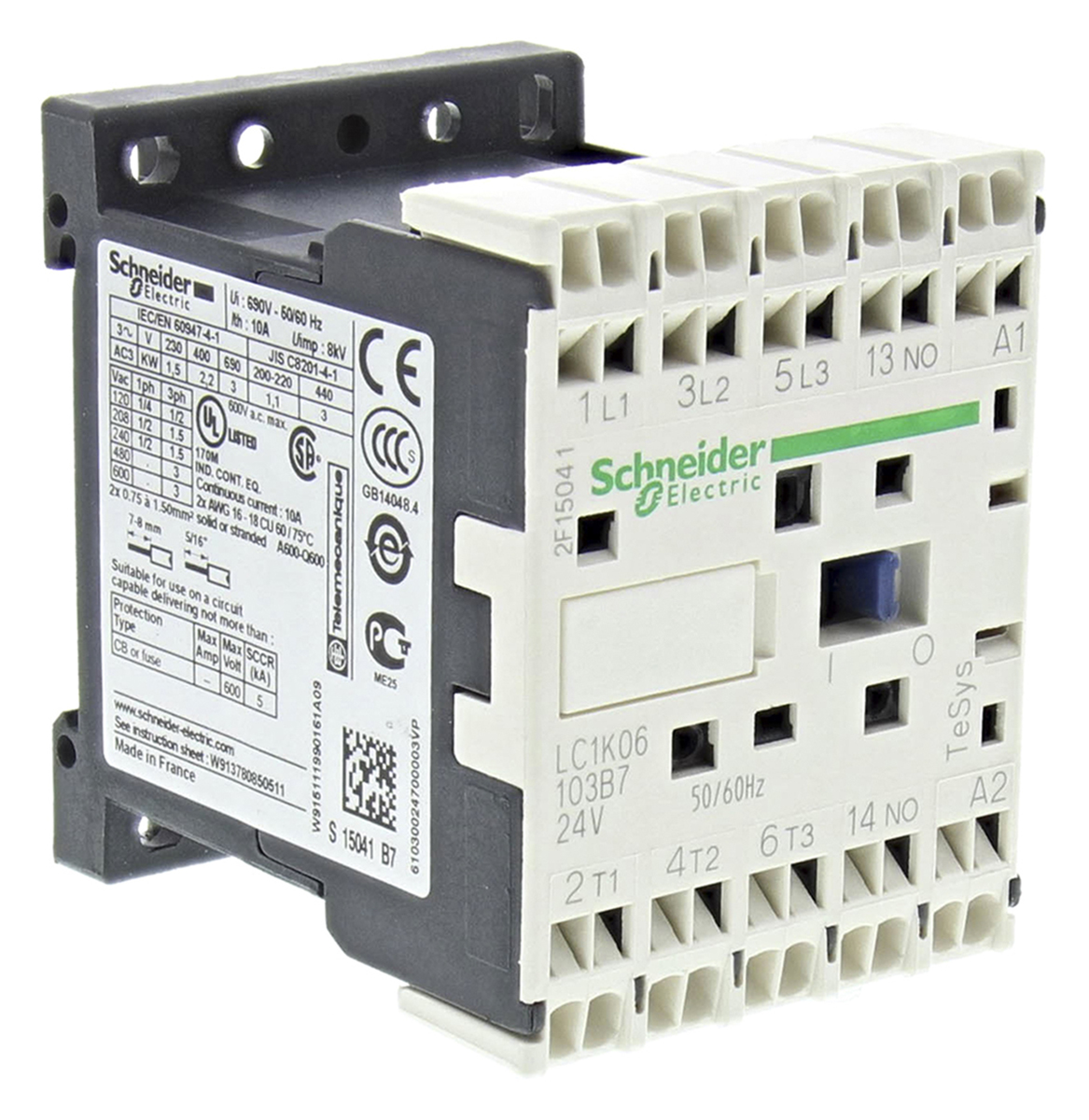 This is TeSys K LC1K 3 Pole Contactor 3NO 6 A 2.2 kW 24 V ac Coil manufactured by Schneider Electric. The manufacturer part number is LC1K06103B7. It has a maximum operating temperature of +50°c. The product lc1k, is a highly preferred choice for users. Whereas, the minimum operating temperature of the product is -25°c. The coil voltage of the product is 24 v ac. Its accurate length is 58mm. Furthermore, the product is 45mm wide. The product comes in 57mm depth. It has equipped with 3 poles. The terminal is a cage clamp type.