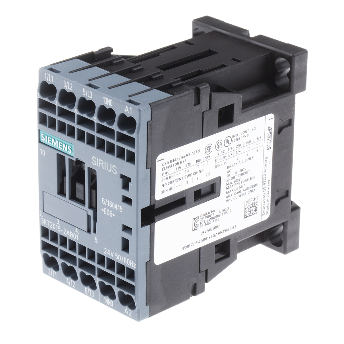 This is Sirius Innovation 3RT2 3 Pole Contactor 3NO 7 A (AC3) 3 kW (AC3) 24 V ac Coil manufactured by Siemens. The manufacturer part number is 3RT2015-2AB01. It has a maximum operating temperature of +60°c. The product 3rt2, is a highly preferred choice for users. Whereas, the minimum operating temperature of the product is -25°c. The coil voltage of the product is 24 v ac. Its accurate length is 70mm. Furthermore, the product is 45mm wide. The product comes in 73mm depth. It has equipped with 3 poles. The terminal is a cage clamp type.