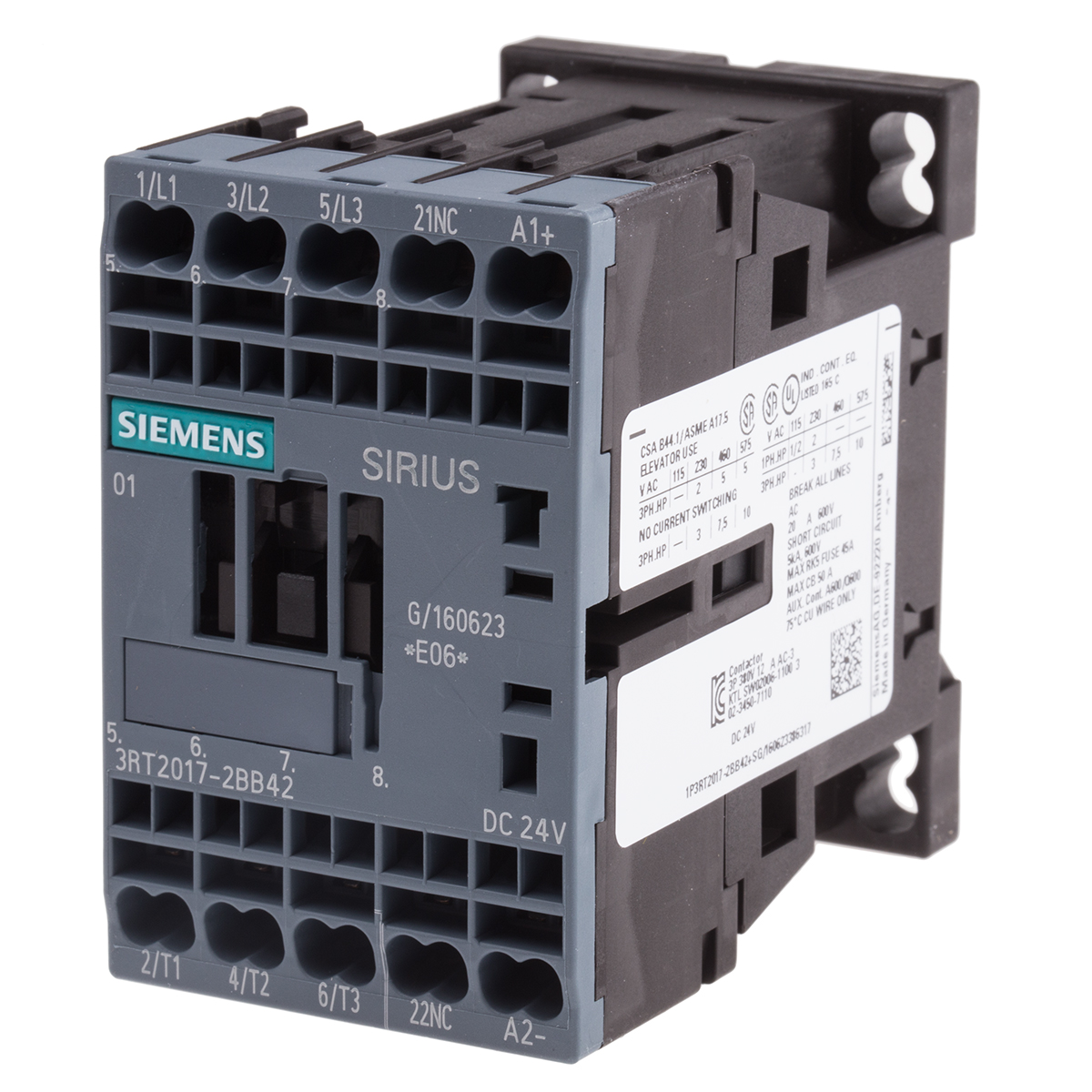 This is Sirius Innovation 3RT2 3 Pole Contactor 3NO 12 A (AC3) 5.5 kW (AC3) 24 V dc Coil manufactured by Siemens. The manufacturer part number is 3RT2017-2BB42. It has a maximum operating temperature of +60°c. The product 3rt2, is a highly preferred choice for users. Whereas, the minimum operating temperature of the product is -25°c. The coil voltage of the product is 24 v dc. Its accurate length is 70mm. Furthermore, the product is 45mm wide. The product comes in 73mm depth. It has equipped with 3 poles. The terminal is a cage clamp type.