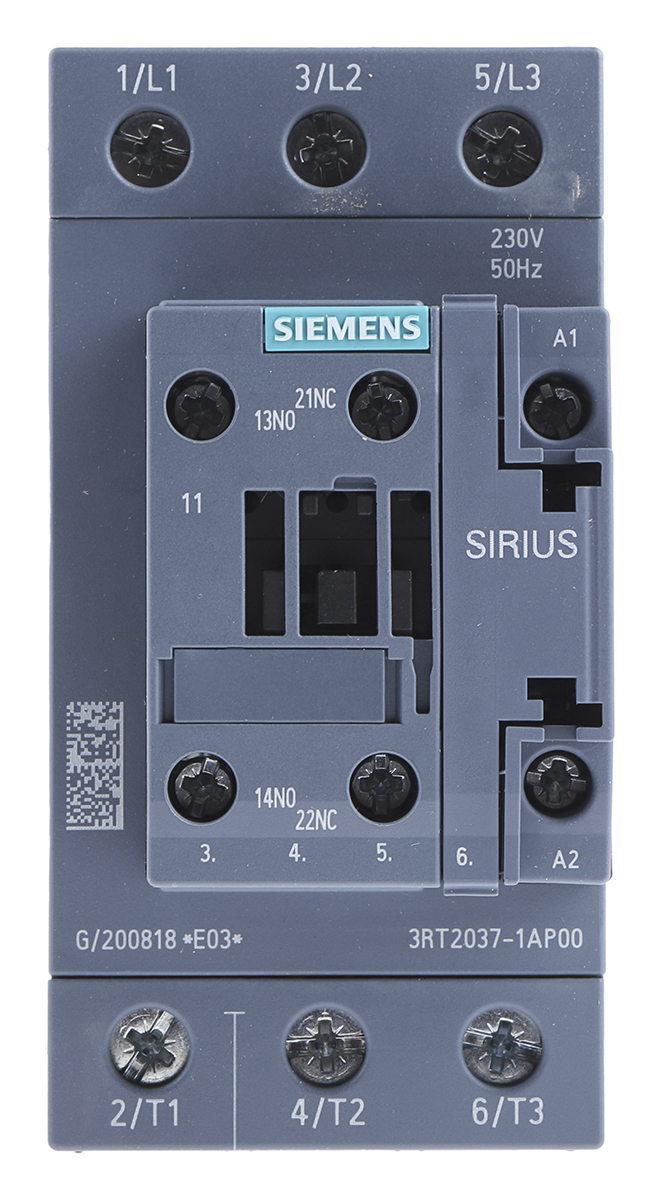 This is Sirius Innovation 3RT2 3 Pole Contactor 3NO (Main) NO/NC (Auxiliary) 65 A (AC3) 30 kW (AC3) 230 V ac Coil manufactured by Siemens. The manufacturer part number is 3RT2037-1AP00. It has a maximum operating temperature of +60°c. The product 3rt2, is a highly preferred choice for users. Whereas, the minimum operating temperature of the product is -25°c. The coil voltage of the product is 230 v ac. Its accurate length is 55mm. Furthermore, the product is 113.4mm wide. The product comes in 130mm depth. It has equipped with 3 poles. The terminal is a screw type.
