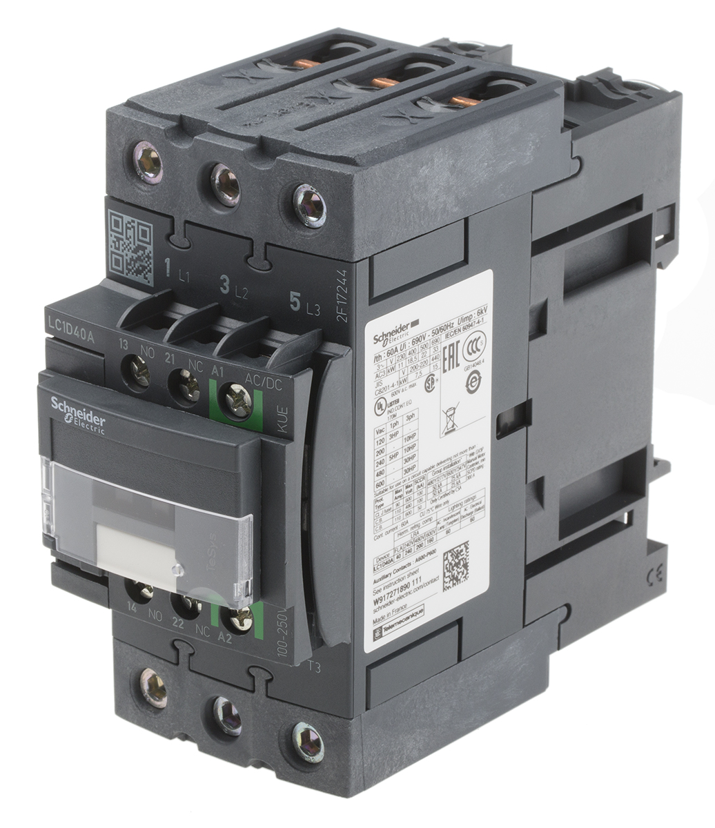 This is TeSys D Green LC1D 3 Pole Contactor 3NO 40 A 18.5 kW V ac @ 380 → 400 manufactured by Schneider Electric. The manufacturer part number is LC1D40AKUE. It has a maximum operating temperature of +60°c. The product lc1d, is a highly preferred choice for users. Whereas, the minimum operating temperature of the product is -25°c. The coil voltage of the product is 230 v ac. Its accurate length is 55mm. Furthermore, the product is 120mm wide. The product comes in 122mm depth. It has equipped with 3 poles. The terminal is a screw type.