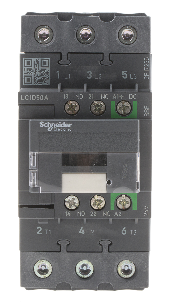 This is TeSys D Green LC1D 3 Pole Contactor 3NO 50 A 22 kW V ac @ 380 → 400 24 V dc Coil manufactured by Schneider Electric. The manufacturer part number is LC1D50ABBE. It has a maximum operating temperature of +60°c. The product lc1d, is a highly preferred choice for users. Whereas, the minimum operating temperature of the product is -25°c. The coil voltage of the product is 24 v dc. Its accurate length is 55mm. Furthermore, the product is 120mm wide. The product comes in 122mm depth. It has equipped with 3 poles. The terminal is a screw type.