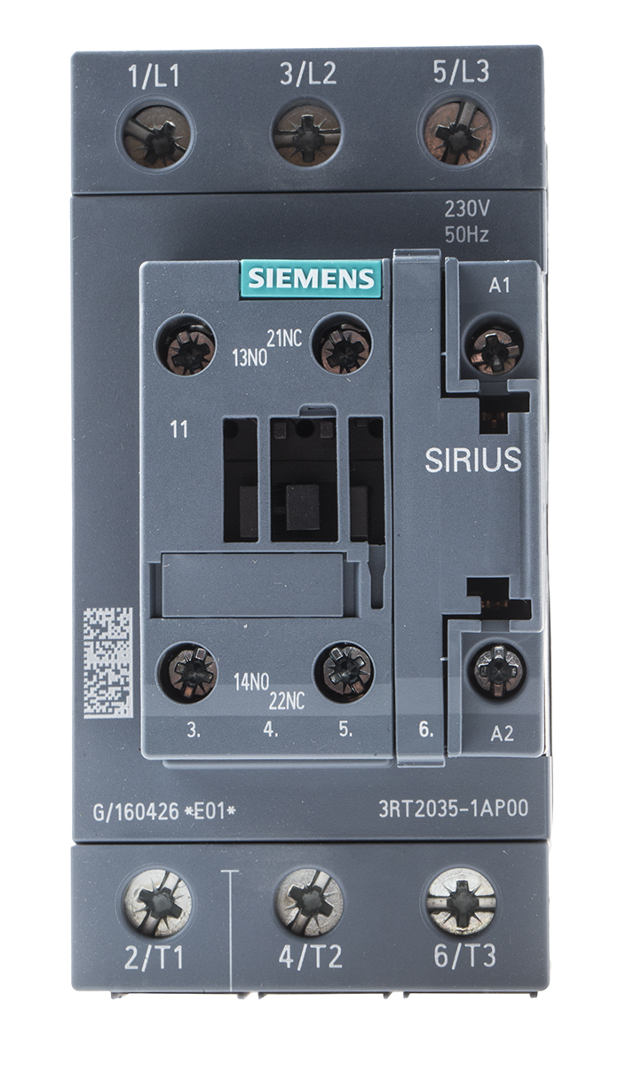 This is Sirius Innovation 3RT2 3 Pole Contactor 3NO (Main) NO/NC (Auxiliary) 40 A (AC3) 18.5 kW (AC3) 230 V ac Coil manufactured by Siemens. The manufacturer part number is 3RT2035-1AP00. It has a maximum operating temperature of +60°c. It has a typical 41a load current. The product 3rt2, is a highly preferred choice for users. The coil voltage of the product is 230 v ac. Its accurate length is 55mm. Furthermore, the product is 113.4mm wide. The product comes in 130mm depth. Whereas, the minimum operating temperature of the product is -25°c. It has equipped with 3 poles. The terminal is a screw type.
