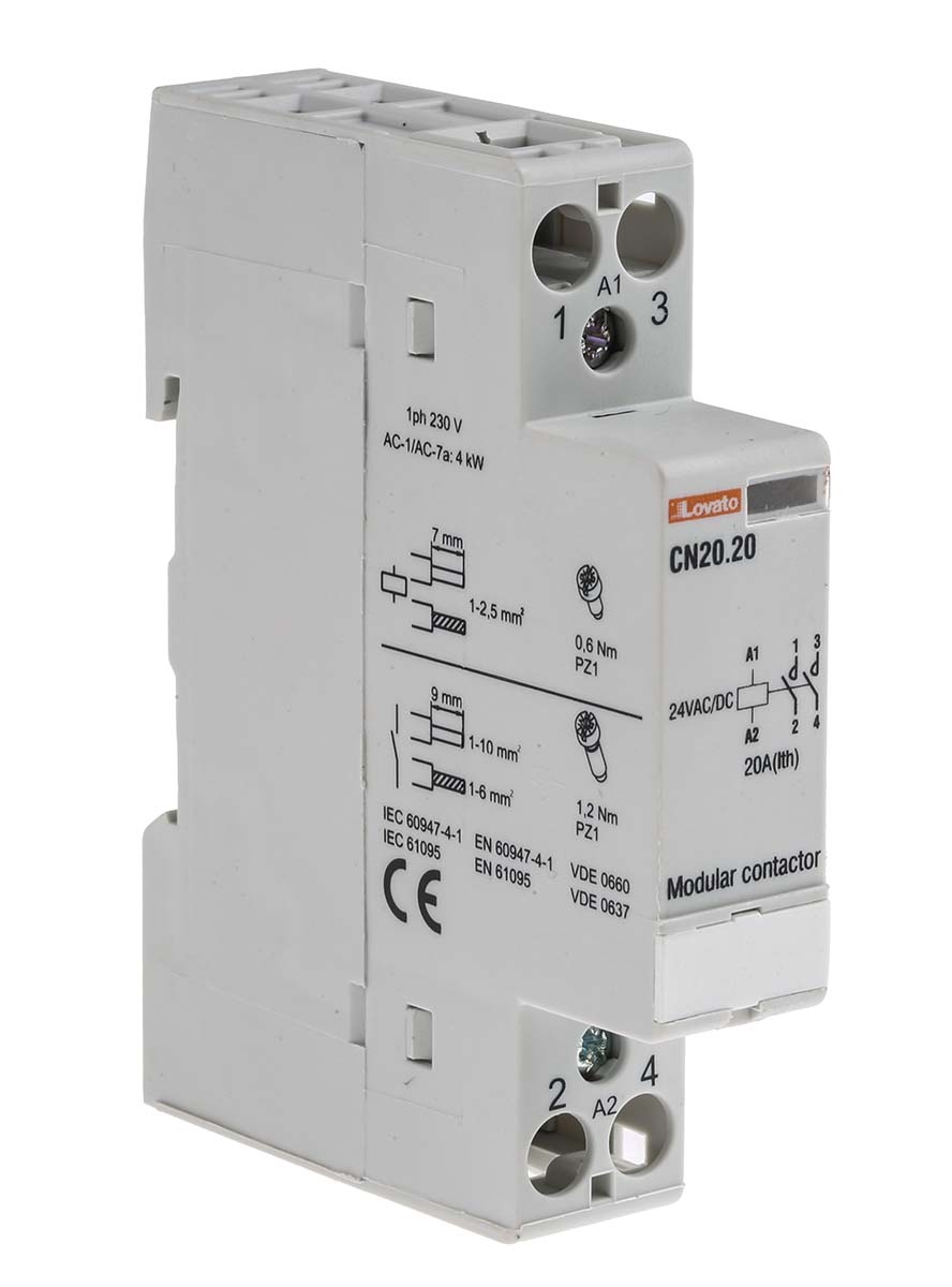 This is MODULAR CONT. 1M 20A AC1 2P 24V manufactured by Lovato. The manufacturer part number is CN2020024. Whereas, the minimum operating temperature of the product is -5°c. It has a maximum operating temperature of +55°c. The coil voltage of the product is 24 v ac/dc. Its accurate length is 17.5mm. Furthermore, the product is 65mm wide. The product comes in 85mm depth. It has equipped with 2 poles. The terminal is a screw type.