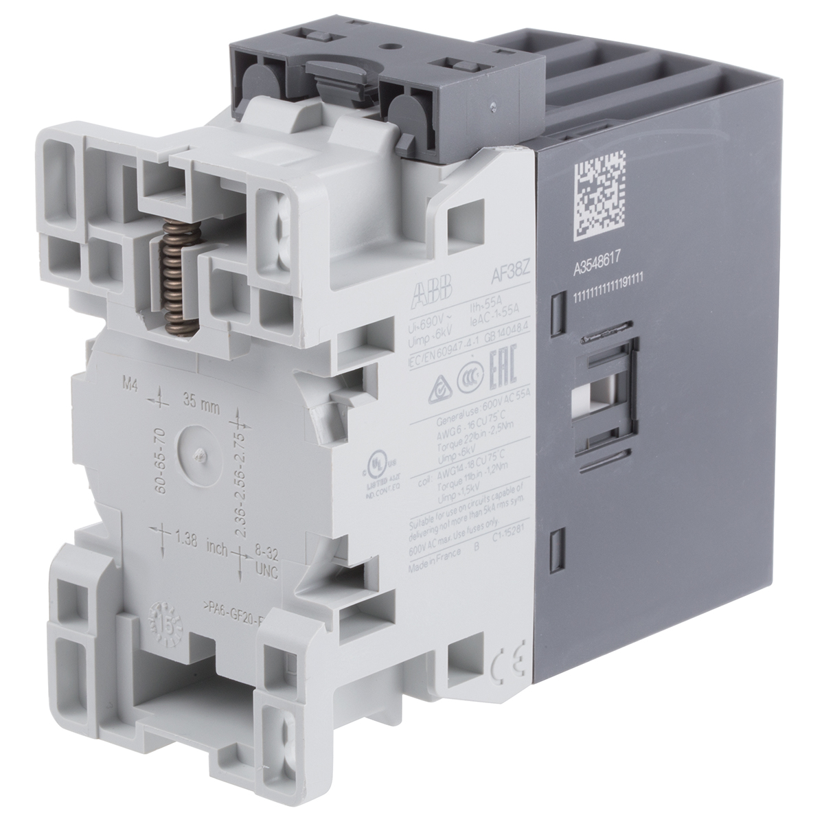 This is AF Range AF38Z 4 Pole Contactor - 55 A 24 V ac/dc Coil 4NO 18.5 kW manufactured by ABB. The manufacturer part number is 1SBL296201R2100 AF38Z-40-00-21. It has a maximum operating temperature of +70°c. The product af, is a highly preferred choice for users. Whereas, the minimum operating temperature of the product is -40°c. The coil voltage of the product is 24 v ac/dc. Its accurate length is 86mm. Furthermore, the product is 45mm wide. The product comes in 101mm depth. It has equipped with 4 poles. The terminal is a screw type.