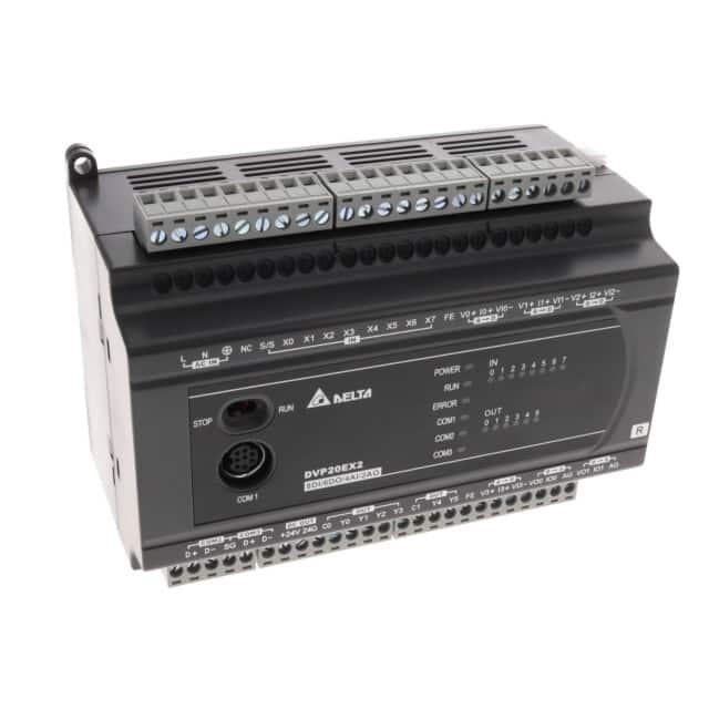 This is manufactured by Delta Electronics/Industrial Automation. The manufacturer part number is DVP20EX200R. It is assigned with possible HTSUS value of 8537.10.9170. The product is rohs3 compliant. Number and outputs type - 8 - analog (2), relay (6). The product has 0°c ~ 55°c operating temperature range. It holds a typical memory size of 10k words. It is approved by ce, culus. The product is available in chassis mount, din rail configuration. In addition, it is reach unaffected. It is shipped in box. Its typical moisture sensitivity level is not applicable. It has a long 40 weeks standard lead time. It features a remarkable no display display. Inputs and Type of Inputs - 12 - digital. The product dvp, is a highly preferred choice for users. It has optimum voltage supply of 100 ~ 240vac. Moreover, it corresponds to dvp20, a base product number of the product. The product is designated with the ear99 code number