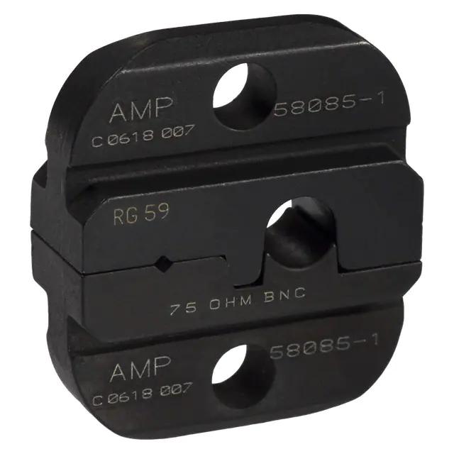 This is manufactured by TE Application Tooling. The manufacturer part number is 58085-1. The product is suitable for use with coaxial, rf - bnc. This is basically a useful and handy die set. It is assigned with possible HTSUS value of 8203.20.8000. It is shipped in bulk. Specifications include diamond - 0.044"; round - 0.240". The product pro-crimper iii, is a highly preferred choice for users. The product is not applicable. Its typical moisture sensitivity level is not applicable. Moreover, it corresponds to 58085, a base product number of the product. The compatible tools include 354940-1. Cable Group Options: rg-59. The product is designated with the ear99 code number