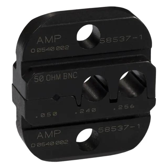 This is manufactured by TE Application Tooling. The manufacturer part number is 58537-1. The product is suitable for use with coaxial, rf - bnc. This is basically a useful and handy die set. It is assigned with possible HTSUS value of 8207.90.7585. It is shipped in bulk. Specifications include diamond - 0.050"; round - 0.240", 0.256". The product pro-crimper iii, is a highly preferred choice for users. The product is not applicable. Its typical moisture sensitivity level is not applicable. Moreover, it corresponds to 58537, a base product number of the product. The compatible tools include 354940-1. It has a long 12 weeks standard lead time. Cable Group Options: rg-59, 62, belden 9104, 9112. The product is designated with the ear99 code number