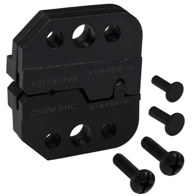 This is manufactured by TE Application Tooling. The manufacturer part number is 318450-2. The product is suitable for use with coaxial, rf - bnc, tnc. This is basically a useful and handy die set. It is assigned with possible HTSUS value of 8203.20.6060. It is shipped in bulk. The product pro-crimper iii, coaxicon, is a highly preferred choice for users. The product is not applicable. Its typical moisture sensitivity level is not applicable. Moreover, it corresponds to 318450, a base product number of the product. The compatible tools include 354940-1. It has a long 10 weeks standard lead time. The product is designated with the ear99 code number