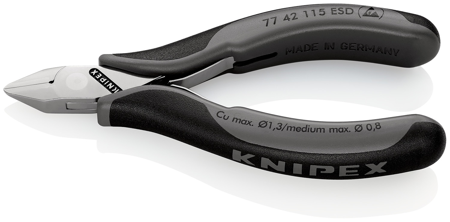 This is 115mm Without Bevel Type Cable Cutter For Hard Wire Medium Wire Soft Wire 1.3mm cutting capacity manufactured by Knipex. The manufacturer part number is 77 42 115 ESDRS. The product is made from highly stable and reliable chrome-plated steel with ball bearings. It comes in electronic side cutter configuration.