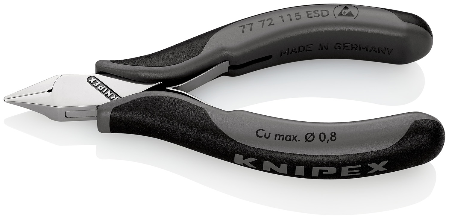 This is 115mm With Bevel Type Cable Cutter For Hard Wire Medium Wire Soft Wire 0.8mm cutting capacity manufactured by Knipex. The manufacturer part number is 77 72 115 ESDRS. The product is made from highly stable and reliable chrome-plated steel with ball bearings. It comes in electronic side cutter configuration.