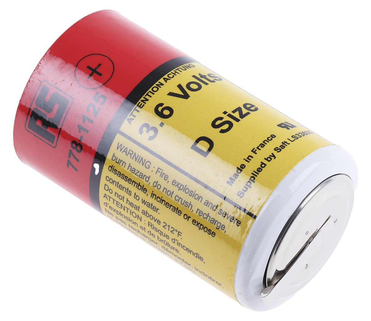 This is 3.6V Lithium Thionyl Chloride D Battery manufactured by RS PRO. The manufacturer part number is 778-1125. The module has the capacity of 17ah. The terminal is a tags type. The product is available in d size.