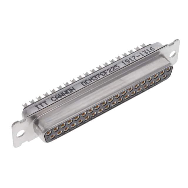 This is manufactured by ITT Cannon, LLC. The manufacturer part number is DCM37SF225. 4 (dc, c) is the shell size and connector layout. Furthermore, housing/shell (unthreaded) is the Flange Feature of the product. It is assigned with possible HTSUS value of 8536.69.4030. The product is rohs compliant. The product has -55°c ~ 125°c operating temperature range. It comes in d-sub connector style. Moreover, the product is constructed from highly polycyclohexylenedimethylene terephthalate (pct) dielectric material. The product carries possible position value of 37. It comes in 2 of rows. It carries ul94 v-0 of material flammability rating. It is shipped in bulk. Moreover, the product has a wire gauge of 20-28 awg. It also has a machined contact form. receptacle, female sockets Connector type offer robust functionality. Furthermore, the product is galvanized with excellent gold contact finishing. Its typical moisture sensitivity level is 1 (unlimited). The product features solder cup termination style. It has a long 14 weeks standard lead time. Additionally, the product's output is 7.5a The product is available in panel mount configuration. It has a classic black colour. The product d*m, is a highly preferred choice for users. It is made from durable shell materials and has an excellent finishing such as stainless steel. It has typical contact type of signal. The product is made from sturdy copper alloy materials. The product is designated with the ear99 code number
