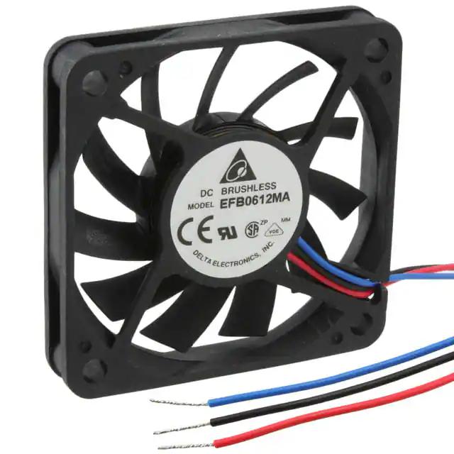 This is manufactured by Delta Electronics. The manufacturer part number is EFB0612MA-F00. The blades are constructed from robust plastic materials. It is assigned with possible HTSUS value of 8414.59.6590. The product is rohs3 compliant. Furthermore, the product is 10.00mm wide. The product features power and watts of 960 mw. It has a 15.5 cfm (0.434m³/min) air flow rate. It is approved by ce, csa, ul, vde. While the voltage range is 7 ~ 13.8vdc. It has noise values of 29.0db(a). It also exhibits voltage rating of 12vdc. In addition, it is reach unaffected. This has integrated with a ball, a bearing with long-lasting features. The product has 14 ~ 158°f (-10 ~ 70°c) operating temperature range. It provides maximum rpm up to 3600 rpm. This product offers longer life span for 70000 hrs @ 40°c. The product has a 0.094 in h2o (23.4 pa) static pressure. It is shipped in bulk. The product's diameters include square - 60mm l x 60mm h. The product features 3 wire leads termination style. Additionally, the product's output is 0.080a Its typical moisture sensitivity level is 1 (unlimited). The splendid features of the product include locked rotor protection, speed sensor (tach). The typical product's weight is 0.062 lb (28.12 g). The product efb, is a highly preferred choice for users. The frame of the product is made from highly durable plastic materials. The latest designed fan is a type of tubeaxial offering unmatchable applications. Moreover, it corresponds to efb0612, a base product number of the product. The product is designated with the ear99 code number