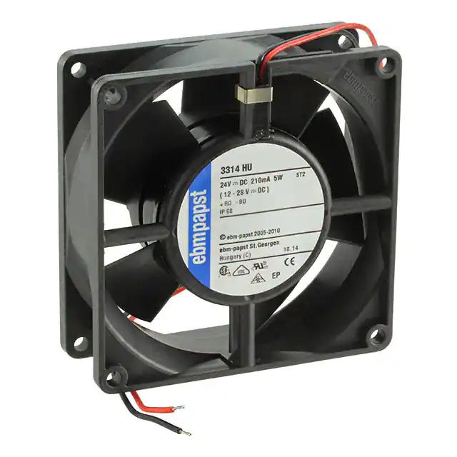 This is manufactured by ebm-papst Inc.. The manufacturer part number is 3314HU. The blades are constructed from robust polyamide (pa), nylon, fiberglass reinforced materials. It is assigned with possible HTSUS value of 8414.59.6590. Furthermore, the product is 32.00mm wide. The product features power and watts of 5 w. It has a 63.0 cfm (1.76m³/min) air flow rate. It is approved by ce, csa, ul, vde. While the voltage range is 12 ~ 28vdc. It has noise values of 47.0db(a). It also exhibits voltage rating of 24vdc. This has integrated with a ball, a bearing with long-lasting features. The product has -4 ~ 167°f (-20 ~ 75°c) operating temperature range. It provides maximum rpm up to 4000 rpm. It is shipped in bulk. The product's diameters include square - 92mm l x 92mm h. The product features 2 wire leads termination style. Its typical moisture sensitivity level is 1 (unlimited). It is IP rated with ip68 - dust tight, waterproof. The typical product's weight is 0.474 lb (215 g). The product 3300u, is a highly preferred choice for users. The frame of the product is made from highly durable polybutylene terephthalate (pbt), fiberglass reinforced materials. The latest designed fan is a type of tubeaxial offering unmatchable applications. The product is designated with the ear99 code number