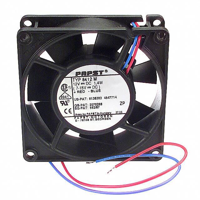 This is manufactured by ebm-papst Inc.. The manufacturer part number is 8412M. The blades are constructed from robust polyamide (pa), nylon materials. It also exhibits voltage rating of 12vdc. Furthermore, the product is 25.00mm wide. The product features power and watts of 1.4 w. It has a 27.0 cfm (0.756m³/min) air flow rate. While the voltage range is 7 ~ 15vdc. It has noise values of 29.0db(a). It is assigned with possible HTSUS value of 8414.59.6590. In addition, it is reach unaffected. This has integrated with a ball, a bearing with long-lasting features. The product's diameters include square - 80mm l x 80mm h. The product features 2 wire leads termination style. Its typical moisture sensitivity level is 1 (unlimited). The typical product's weight is 0.31 lb (140.61 g). The product 8400, is a highly preferred choice for users. The frame of the product is made from highly durable polybutylene terephthalate (pbt), fiberglass reinforced materials. The latest designed fan is a type of tubeaxial offering unmatchable applications. The product is designated with the ear99 code number