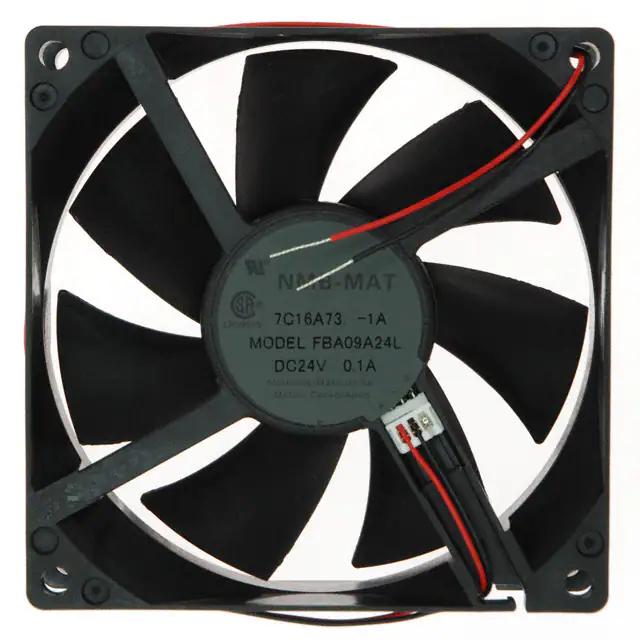 This is manufactured by NMB Technologies Corporation. The manufacturer part number is FBA09A24L1A. It also exhibits voltage rating of 24vdc. Furthermore, the product is 25.50mm wide. The product features power and watts of 1.92 w. It has a 42.7 cfm (1.20m³/min) air flow rate. It is approved by csa, ul. While the voltage range is 14 ~ 27.6vdc. It has noise values of 27.0db. It is assigned with possible HTSUS value of 8414.59.6590. In addition, it is reach unaffected. This has integrated with a hydro-wave (hwb), a bearing with long-lasting features. The product has 14 ~ 158°f (-10 ~ 70°c) operating temperature range. It provides maximum rpm up to 2200 rpm. This product offers longer life span for 50000 hrs @ 40°c. The product has a 0.102 in h2o (25.5 pa) static pressure. The product's diameters include square - 92mm l x 92mm h. The product features 2 wire leads termination style. Additionally, the product's output is 0.080a Its typical moisture sensitivity level is not applicable. The typical product's weight is 0.243 lb (110.22 g). The product fba, is a highly preferred choice for users. The latest designed fan is a type of tubeaxial offering unmatchable applications. The product is designated with the ear99 code number