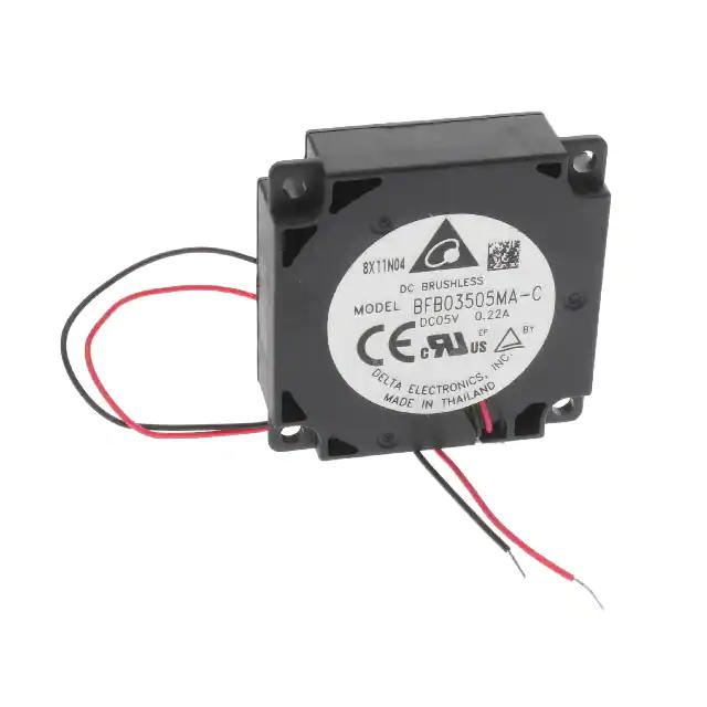 This is manufactured by Delta Electronics. The manufacturer part number is BFB03505MA-C. The blades are constructed from robust plastic materials. It is assigned with possible HTSUS value of 8414.59.6560. The product is rohs3 compliant. Furthermore, the product is 10.00mm wide. The product features power and watts of 600 mw. It has a 1.6 cfm (0.045m³/min) air flow rate. It is approved by ce, curus, tuv. While the voltage range is 4.5 ~ 5.5vdc. It has noise values of 26.0db(a). It also exhibits voltage rating of 5vdc. In addition, it is reach unaffected. This has integrated with a ball, a bearing with long-lasting features. The product has 14 ~ 158°f (-10 ~ 70°c) operating temperature range. It provides maximum rpm up to 6500 rpm. This product offers longer life span for 30000 hrs @ 40°c. The product has a 0.236 in h2o (58.8 pa) static pressure. It is shipped in box. The product's diameters include square - 35mm l x 35mm h. The product features 2 wire leads termination style. Additionally, the product's output is 0.120a Its typical moisture sensitivity level is 1 (unlimited). The splendid features of the product include locked rotor protection. The typical product's weight is 0.025 lb (11.34 g). The product bfb, is a highly preferred choice for users. The frame of the product is made from highly durable plastic materials. The latest designed fan is a type of blower offering unmatchable applications. Moreover, it corresponds to bfb03505, a base product number of the product. The product is designated with the ear99 code number