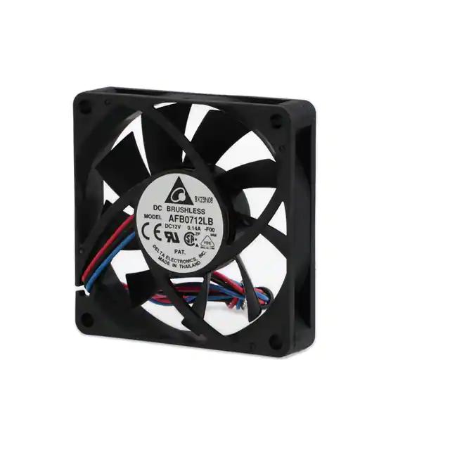 This is manufactured by Delta Electronics. The manufacturer part number is AFB0712LB-F00. The blades are constructed from robust plastic materials. It is assigned with possible HTSUS value of 8414.59.6590. The product is rohs3 compliant. Furthermore, the product is 15.00mm wide. The product features power and watts of 960 mw. It has a 23.4 cfm (0.655m³/min) air flow rate. It is approved by ce, csa, ul, vde. While the voltage range is 4 ~ 13.8vdc. It has noise values of 26.5db(a). It also exhibits voltage rating of 12vdc. In addition, it is reach unaffected. This has integrated with a ball, a bearing with long-lasting features. The product has 14 ~ 158°f (-10 ~ 70°c) operating temperature range. It provides maximum rpm up to 2800 rpm. This product offers longer life span for 70000 hrs @ 40°c. The product has a 0.089 in h2o (22.2 pa) static pressure. It is shipped in box. The product's diameters include square - 70mm l x 70mm h. The product features 3 wire leads termination style. Additionally, the product's output is 0.080a Its typical moisture sensitivity level is not applicable. The splendid features of the product include locked rotor protection, speed sensor (tach). The typical product's weight is 0.104 lb (47.17 g). The product afb, is a highly preferred choice for users. The frame of the product is made from highly durable plastic materials. The latest designed fan is a type of tubeaxial offering unmatchable applications. Moreover, it corresponds to afb0712, a base product number of the product. The product is designated with the ear99 code number