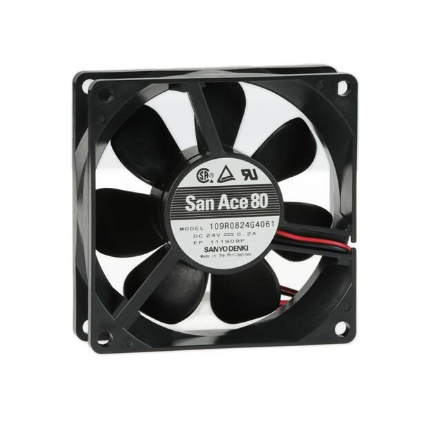 This is manufactured by Sanyo Denki America Inc.. The manufacturer part number is 109R0824G4061. The blades are constructed from robust plastic materials. It is assigned with possible HTSUS value of 8414.59.6590. The product is rohs3 compliant. Furthermore, the product is 25.00mm wide. The product features power and watts of 4.8 w. It has a 53.0 cfm (1.48m³/min) air flow rate. While the voltage range is 20.4 ~ 26.4vdc. It has noise values of 40.0db(a). It also exhibits voltage rating of 24vdc. This has integrated with a ball, a bearing with long-lasting features. The product has -4 ~ 140°f (-20 ~ 60°c) operating temperature range. It provides maximum rpm up to 4500 rpm. The product has a 0.323 in h2o (80.4 pa) static pressure. It is shipped in box. The product's diameters include square - 80mm l x 80mm h. The product features 2 position rectangular connector termination style. Additionally, the product's output is 0.200a Its typical moisture sensitivity level is not applicable. The splendid features of the product include locked rotor protection. The typical product's weight is 0.243 lb (110.22 g). The product san ace 80, is a highly preferred choice for users. The frame of the product is made from highly durable plastic materials. The latest designed fan is a type of tubeaxial offering unmatchable applications. Moreover, it corresponds to 109r0824, a base product number of the product. The product is designated with the ear99 code number