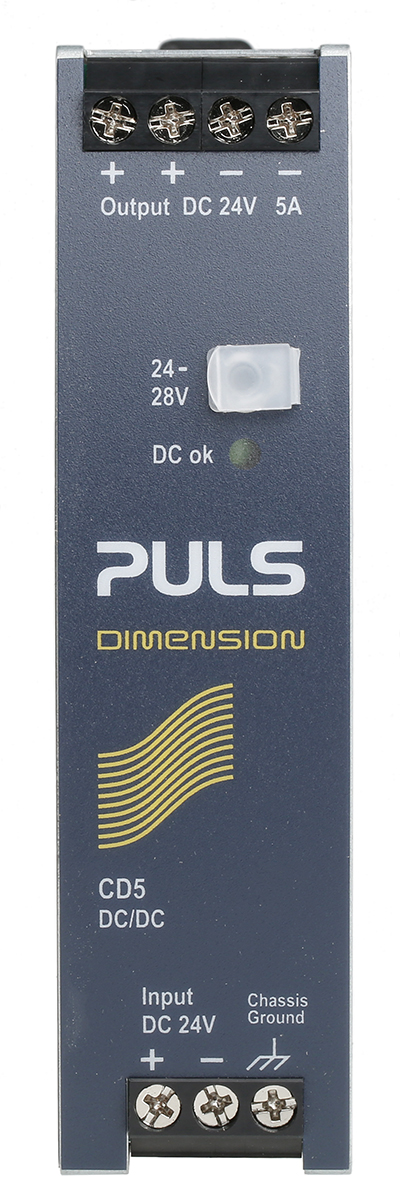 This is DIMENSION-CD 120W Isolated DC-DC Converter DIN Rail Mount Vin 18 → 32.4 V dc Vout 24V dc manufactured by PULS. The manufacturer part number is CD5.241. Additionally, the product is supplied with 1 outputs. Load Regulation - 100mv. The product is available in din rail mount configuration. It is a highly efficient product with an 90.5% of high efficiency. The product dimension-cd, is a highly preferred choice for users. Furthermore, the product is 32mm wide. The product comes in 102mm depth. Its accurate length is 124mm.