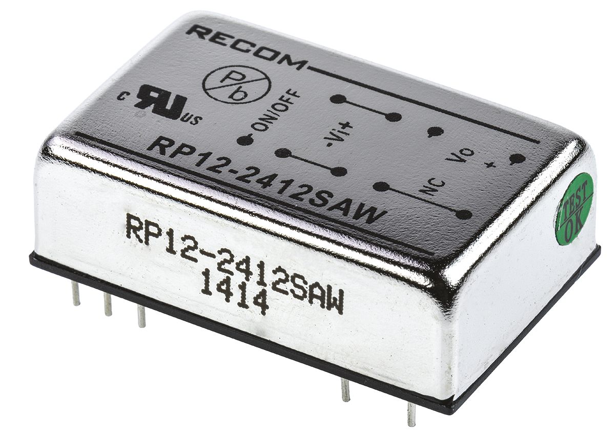 This is RP12 AW 12W Isolated DC-DC Converter Through Hole Vin 9 → 36 V dc Vout 12V dc I/O isolation 1.6kV dc manufactured by Recom. The manufacturer part number is RP12-2412SAW. Additionally, the product is supplied with 1 outputs. The product is available in through hole configuration. It is shipped in dip. The product rp12-aw, is a highly preferred choice for users. The product comes in 10.2mm depth. Its accurate length is 31.8mm.