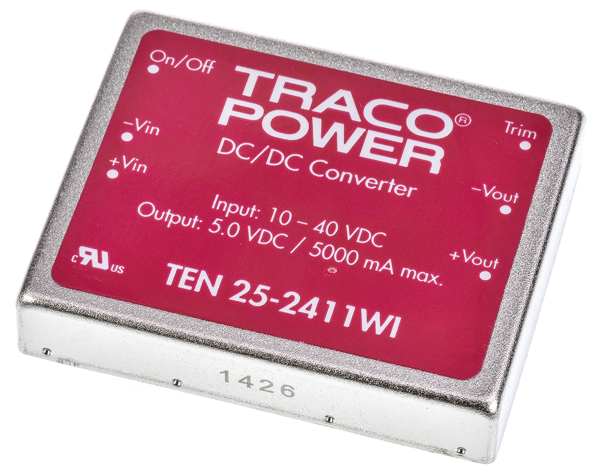 This is TEN 25WI 25 W 30 W Isolated DC-DC Converter Through Hole Vin 10 → 40 V dc Vout 5V dc manufactured by TRACOPOWER. The manufacturer part number is TEN 25-2411WI. Additionally, the product is supplied with 1 outputs. Load Regulation - ±1%. The product is available in through hole configuration. It is shipped in 1 x 1.6 in. The product ten 25wi, is a highly preferred choice for users. It is a highly efficient product with an 85% of high efficiency. The product comes in 9.3mm depth. Its accurate length is 50mm.