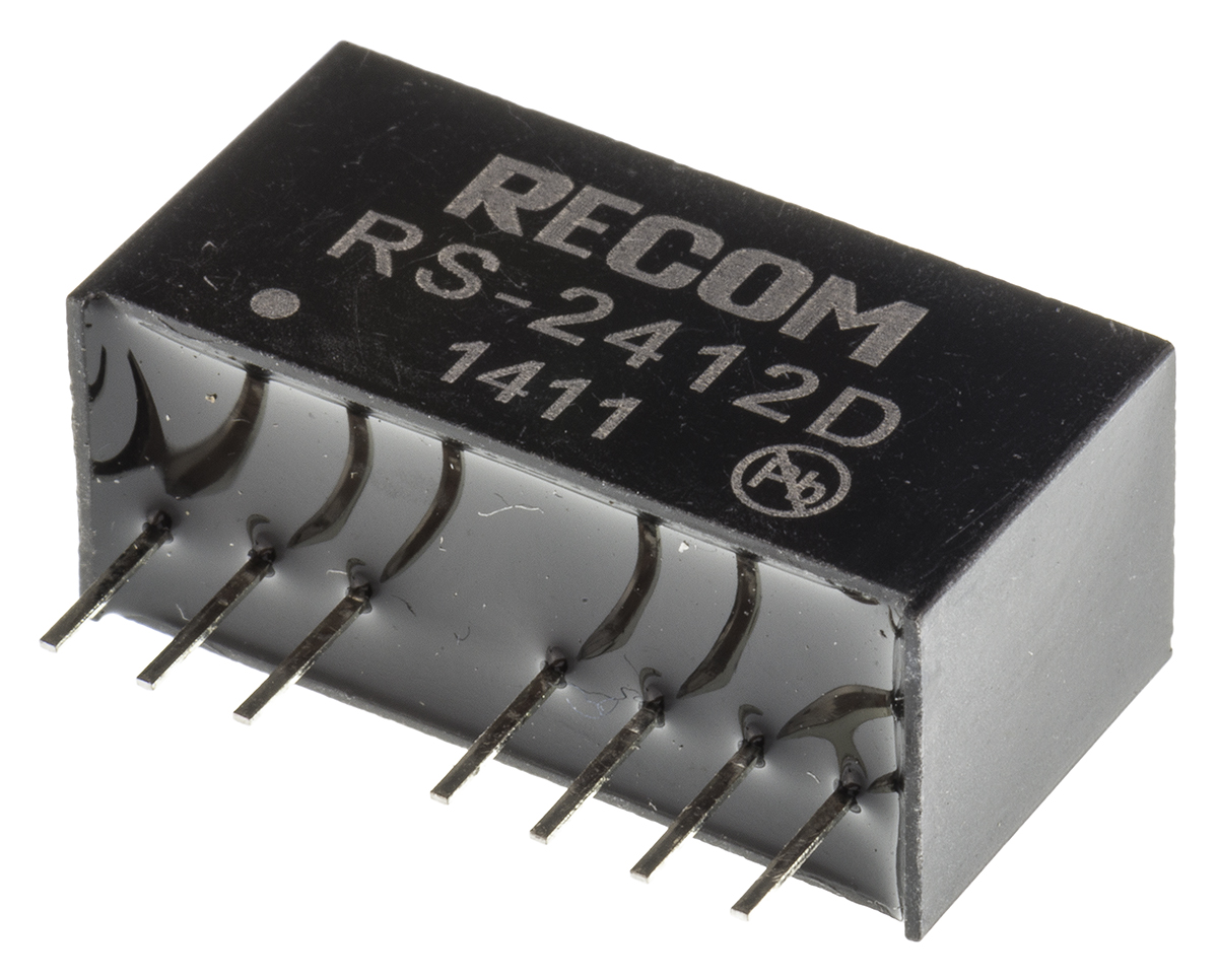 This is RS 2W Isolated DC-DC Converter Through Hole Vin 18 → 36 V dc Vout ±12V dc I/O isolation 500V ac manufactured by Recom. The manufacturer part number is RS-2412D. Additionally, the product is supplied with 2 outputs. Load Regulation - ±0.5%. The product is available in through hole configuration. It is shipped in sip. The product rs, is a highly preferred choice for users. It is a highly efficient product with an 83% of high efficiency. The product comes in 11.1mm depth. Its accurate length is 21.8mm.