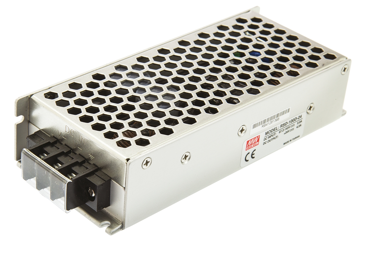 This is RSD 100 100.8W Isolated DC-DC Converter Chassis Mount Vin 57.6 → 154 V dc Vout 24V dc manufactured by Mean Well. The manufacturer part number is RSD-100D-24. Additionally, the product is supplied with 1 outputs. Load Regulation - ±1%. The product is available in chassis mount configuration. The product rsd 100, is a highly preferred choice for users. Its accurate length is 161mm. The product comes in 36mm depth.