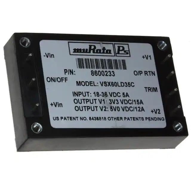 This is manufactured by Murata Power Solutions Inc.. The manufacturer part number is VSX60LD35C. It is assigned with possible HTSUS value of 8504.40.9580. Additionally, the product is supplied with 2 outputs. It has a 5v output voltage. The product features power and watts of 60 w. The maximum product's output current is 12a, 15a. Moreover, the product comes in [Package/ Case]. It offers 18v of minimum input voltage. It comes in isolated module configuration. The product is widely employed in ite (commercial). In addition, it is reach unaffected. 3.3v of voltage output 2. It is a highly efficient product with an 90% of high efficiency. Its maximum input voltage is 36v. It is shipped in tube. The product's diameters include 2.30" l x 1.50" w x 0.50" h (58.4mm x 28.1mm x 12.7mm). 1.5 kv of isolation voltage. Its typical moisture sensitivity level is 1 (unlimited). The product is available in through hole configuration. The product vsx60xd35c (60w), is a highly preferred choice for users. The product has -40°c ~ 100°c operating temperature range. Moreover, it corresponds to vsx60, a base product number of the product. The product is designated with the ear99 code number