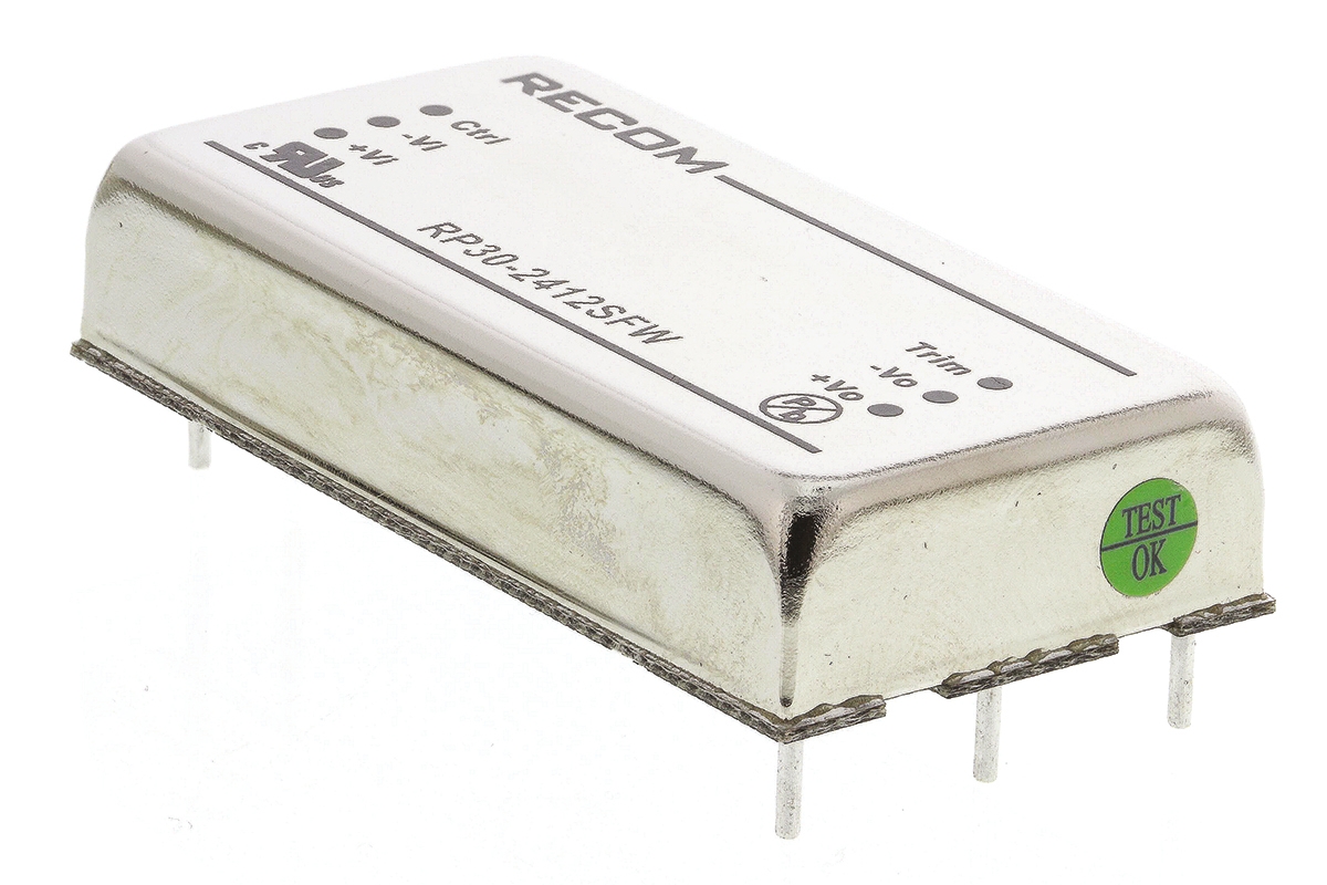 This is RP30 FW 30W Isolated DC-DC Converter Through Hole Vin 9 → 36 V dc Vout 12V dc I/O isolation 1.6kV dc manufactured by Recom. The manufacturer part number is RP30-2412SFW. Additionally, the product is supplied with 1 outputs. The product is available in through hole configuration. The product rp30 fw, is a highly preferred choice for users. Its accurate length is 50.8mm. The product comes in 10.2mm depth.