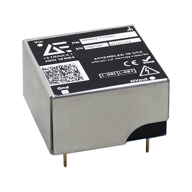 This is manufactured by Advanced Energy. The manufacturer part number is MPM12-500NS. It is assigned with possible HTSUS value of 8504.40.9580. The product is rohs3 compliant. The product features power and watts of 15 w. The maximum product's output current is 3ma. It is approved by ce. Moreover, the product comes in [Package/ Case]. It offers 2v of minimum input voltage. It comes in high voltage - isolated module configuration. The product is widely employed in ite (commercial). It has a -84 ~ -500v output voltage. Its maximum input voltage is 12v. Possible control features include enable, active low. It is shipped in bulk. The product's diameters include 1.55" l x 1.55" w x 0.85" h (39.4mm x 39.4mm x 21.6mm). It has a long 16 weeks standard lead time. Its typical moisture sensitivity level is 1 (unlimited). The splendid features of the product include adjustable output. The product is available in through hole configuration. The product ultravolt® mpm, is a highly preferred choice for users. The product has -10°c ~ 60°c operating temperature range. Moreover, it corresponds to mpm12, a base product number of the product. Additionally, the product is supplied with 1 outputs. The product is designated with the ear99 code number