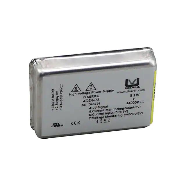 This is manufactured by Advanced Energy. The manufacturer part number is 4D24-P2. It is assigned with possible HTSUS value of 8504.40.9580. The product is rohs3 compliant. The product features power and watts of 2 w. The maximum product's output current is 500µa. Moreover, the product comes in [Package/ Case]. It offers 22v of minimum input voltage. It comes in high voltage - non-isolated module configuration. The product is widely employed in ite (commercial). It has a 0 ~ 4000v output voltage. Its maximum input voltage is 26v. It is shipped in bulk. The product's diameters include 2.50" l x 1.73" w x 0.69" h (63.5mm x 44.0mm x 17.5mm). It has a long 16 weeks standard lead time. Its typical moisture sensitivity level is not applicable. The splendid features of the product include adjustable output, remote on/off. The product is available in through hole configuration. The product ultravolt® d, is a highly preferred choice for users. The product has -10°c ~ 65°c operating temperature range. Additionally, the product is supplied with 1 outputs. The product is designated with the ear99 code number
