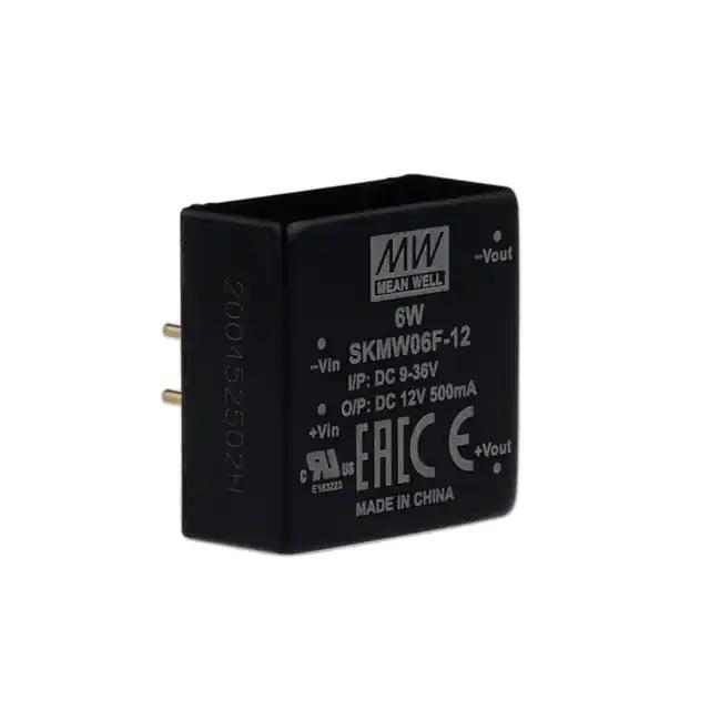 This is manufactured by MEAN WELL USA Inc.. The manufacturer part number is SKMW06F-12. It is assigned with possible HTSUS value of 8504.40.9580. The product is rohs3 compliant. It has a 12v output voltage. The product features power and watts of 6 w. The maximum product's output current is 500ma. It is approved by ce, curus, eac. Moreover, the product comes in [Package/ Case]. It offers 9v of minimum input voltage. It comes in isolated module configuration. The product is widely employed in ite (commercial). In addition, it is reach unaffected. It is a highly efficient product with an 85% of high efficiency. Its maximum input voltage is 36v. It is shipped in tube. The product's diameters include 1.00" l x 1.00" w x 0.46" h (25.4mm x 25.4mm x 11.7mm). It has a long 23 weeks standard lead time. 1.5 kv of isolation voltage. Its typical moisture sensitivity level is not applicable. The product is available in through hole configuration. The product skmw06 (6w), is a highly preferred choice for users. The product has -40°c ~ 85°c (with derating) operating temperature range. Moreover, it corresponds to skmw06, a base product number of the product. Additionally, the product is supplied with 1 outputs. The product is designated with the ear99 code number