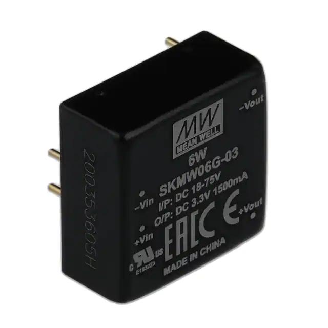 This is manufactured by MEAN WELL USA Inc.. The manufacturer part number is SKMW06G-03. It is assigned with possible HTSUS value of 8504.40.9580. The product is rohs3 compliant. It has a 3.3v output voltage. The product features power and watts of 5 w. The maximum product's output current is 1.5a. It is approved by ce, curus, eac. Moreover, the product comes in [Package/ Case]. It offers 18v of minimum input voltage. It comes in isolated module configuration. The product is widely employed in ite (commercial). In addition, it is reach unaffected. It is a highly efficient product with an 77% of high efficiency. Its maximum input voltage is 75v. It is shipped in tube. The product's diameters include 1.00" l x 1.00" w x 0.46" h (25.4mm x 25.4mm x 11.7mm). It has a long 23 weeks standard lead time. 1.5 kv of isolation voltage. Its typical moisture sensitivity level is not applicable. The product is available in through hole configuration. The product skmw06 (6w), is a highly preferred choice for users. The product has -40°c ~ 85°c (with derating) operating temperature range. Moreover, it corresponds to skmw06, a base product number of the product. Additionally, the product is supplied with 1 outputs. The product is designated with the ear99 code number