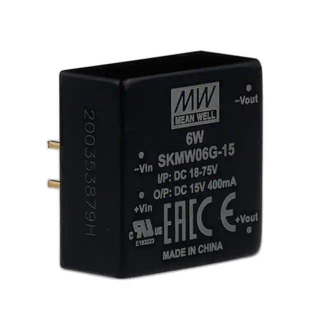 This is manufactured by MEAN WELL USA Inc.. The manufacturer part number is SKMW06G-15. It is assigned with possible HTSUS value of 8504.40.9580. The product is rohs3 compliant. It has a 15v output voltage. The product features power and watts of 6 w. The maximum product's output current is 400ma. It is approved by ce, curus, eac. Moreover, the product comes in [Package/ Case]. It offers 18v of minimum input voltage. It comes in isolated module configuration. The product is widely employed in ite (commercial). In addition, it is reach unaffected. It is a highly efficient product with an 86% of high efficiency. Its maximum input voltage is 75v. It is shipped in tube. The product's diameters include 1.00" l x 1.00" w x 0.46" h (25.4mm x 25.4mm x 11.7mm). It has a long 23 weeks standard lead time. 1.5 kv of isolation voltage. Its typical moisture sensitivity level is not applicable. The product is available in through hole configuration. The product skmw06 (6w), is a highly preferred choice for users. The product has -40°c ~ 85°c (with derating) operating temperature range. Moreover, it corresponds to skmw06, a base product number of the product. Additionally, the product is supplied with 1 outputs. The product is designated with the ear99 code number