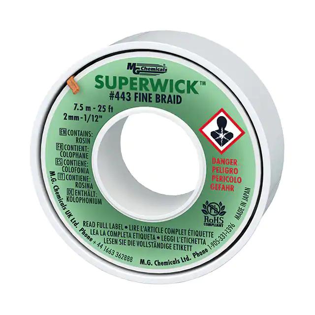 This is manufactured by MG Chemicals. The manufacturer part number is 443. It is assigned with possible HTSUS value of 7413.00.1000. The product is rohs3 compliant. Furthermore, the product is 0.075" (1.91mm) wide. It comes in rosin, mildly activated (rma), lead free configuration. In addition, it is reach unaffected. It offers storage features at 72°f ~ 81°f (22°c ~ 27°c). It is shipped in bulk. Its typical moisture sensitivity level is not applicable. Its accurate length is 25' (7.62m). It has a long 2 weeks standard lead time. It has a classic green colour. The product superwick, 400, is a highly preferred choice for users. The product is designated with the ear99 code number