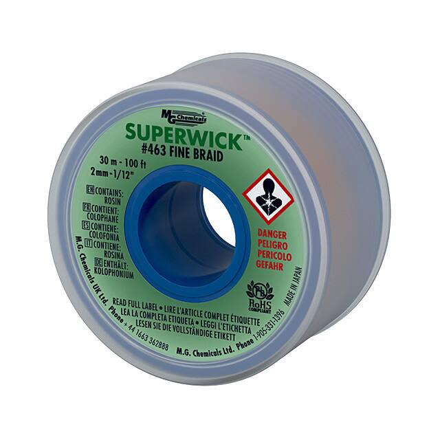 This is manufactured by MG Chemicals. The manufacturer part number is 463. It is assigned with possible HTSUS value of 7413.00.1000. The product is rohs3 compliant. Furthermore, the product is 0.075" (1.91mm) wide. It comes in rosin, mildly activated (rma), lead free configuration. In addition, it is reach unaffected. It offers storage features at 72°f ~ 81°f (22°c ~ 27°c). It is shipped in bulk. Its typical moisture sensitivity level is not applicable. Its accurate length is 100' (30.5m). It has a classic green colour. The product superwick, 400, is a highly preferred choice for users. The product is designated with the ear99 code number